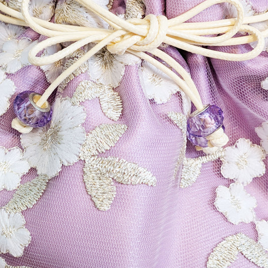 White Floral Embroidery Drawstring Bag - Purple Pink