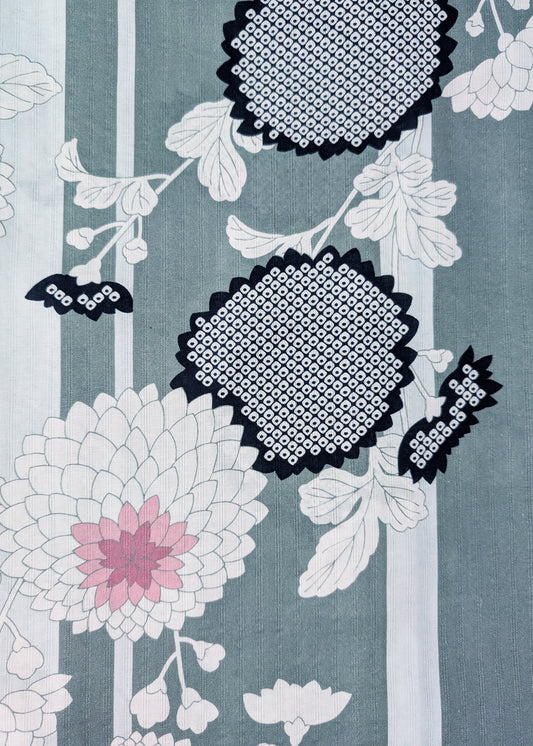 Yukata Kimono - White Peonies in Green Stripes (Style #2656)