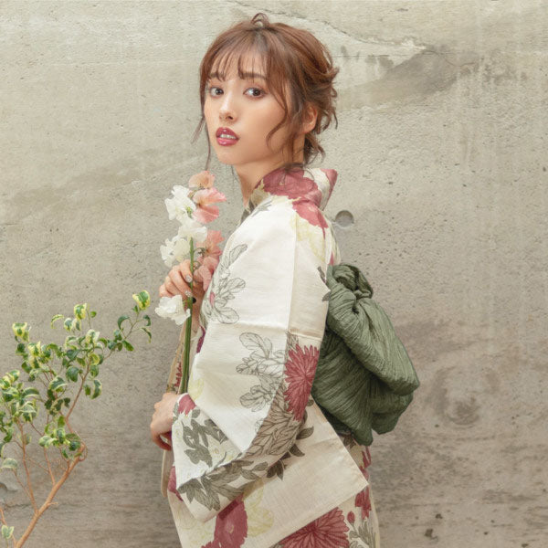 This Japanese soft crepe obi features a solid green color. It's a great accessory for a floral yukata.