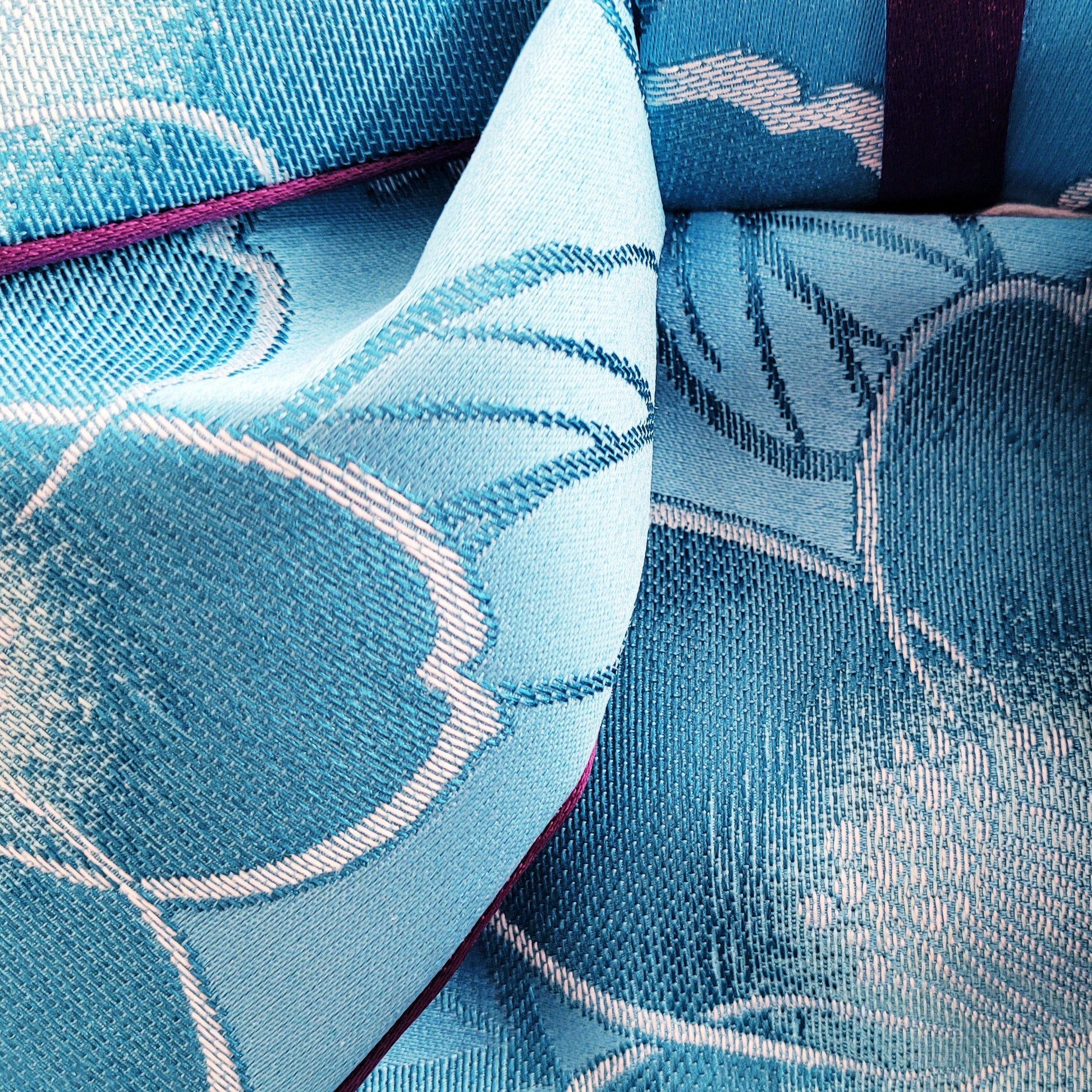Blue with purple accent, this Japanese obi belt features bold and beautiful camellia flower pattern.